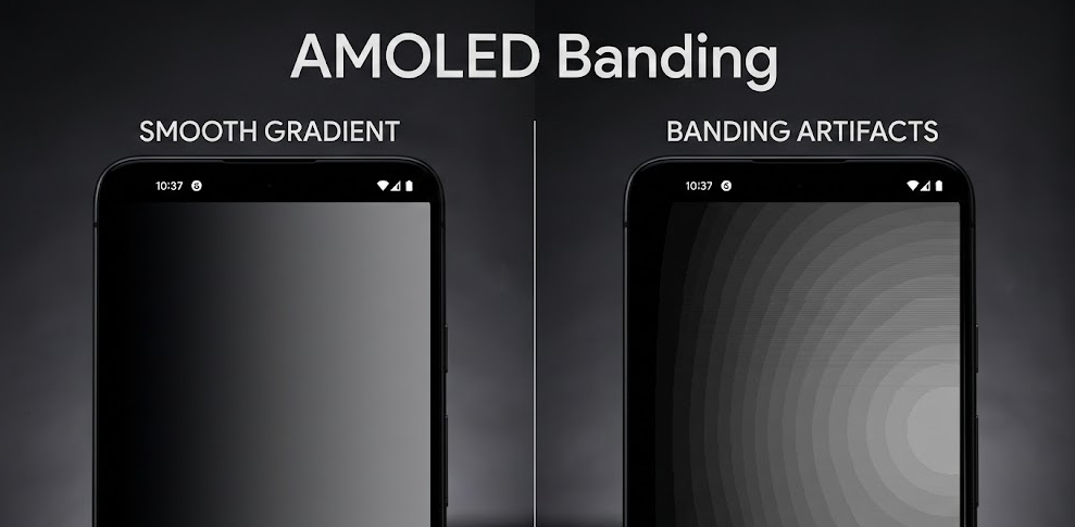 Las bandas AMOLED se refieren a franjas verticales u horizontales visibles que aparecen más claramente en fondos de color gris oscuro o escenas oscuras uniformes. Es un fenómeno de falta de uniformidad de luminancia , que normalmente se observa entre niveles de escala de grises del 1% al 20%.